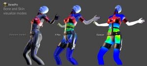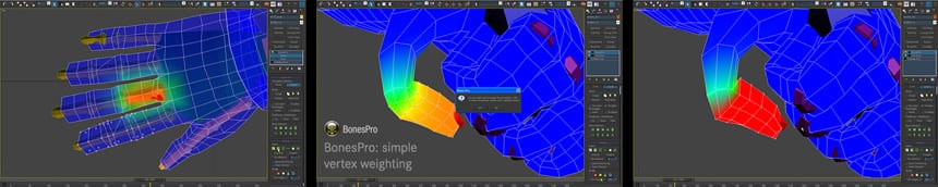 BonesProは少ない工程で高度なキャラクタースキニングの設定を行うことができます。ボーンのサイズを細かく調整する代わりに、メッシュにボーンに割り当てるだけで基本設定は終了です。必要最小限の調整で正確に設定することができます。