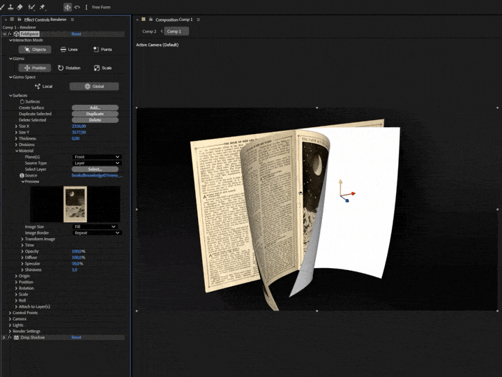 サーフェスまたは制御点を含むFoldspaceのオブジェクトはAfter Effectsのレイヤーに紐付けることができます。紐付いたオブジェクトはアニメーションを含むレイヤーのすべての変換を継承、After Effectsのネイティブツールを利用してしてFoldspaceを制御することができます。Foldspaceは、After Effectsのネイティブカメラとライトに加え、エフェクトから直接制御するカスタムカメラとライトもサポートします。