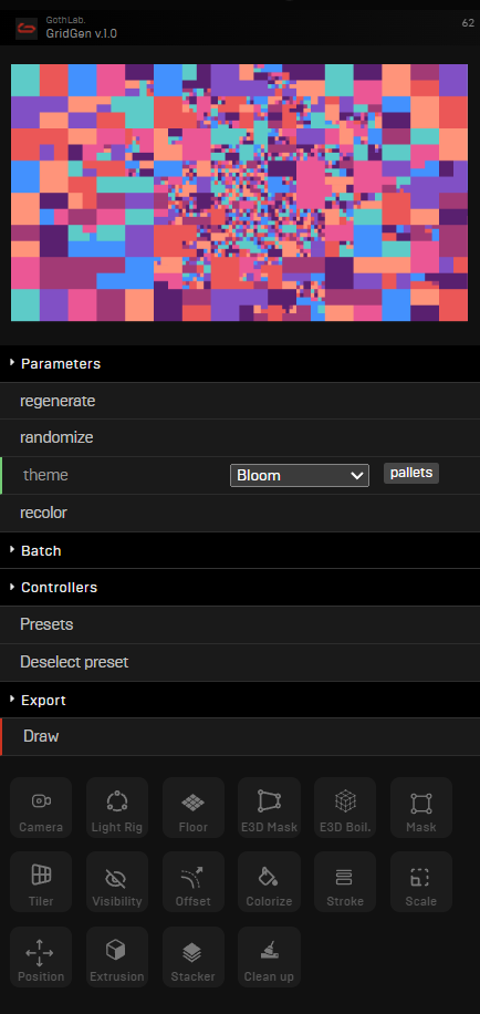 After Effectsを起動してウィンドウ > エクステンションからGridGenを起動します。Parametersではグリッドの分割を定義します。themeではビルトインの200種類以上のカラーテーマを利用してグリッドを着色、recolorでは選択したカラーテーマをベースに配色し直します。さらにエクステンションは60種類のプリセットを搭載します。Parametersで生成したDrawボタンからコンポジションにグリッドを生成したり、ExportボタンからSVGやAiでのエクスポートにも対応します。生成したグリッドのレイアウトやカラー、アニメーション、3D押し出しを制御する場合はGroup Masterにチェックを入れて生成します。