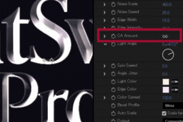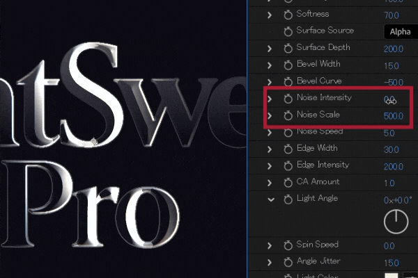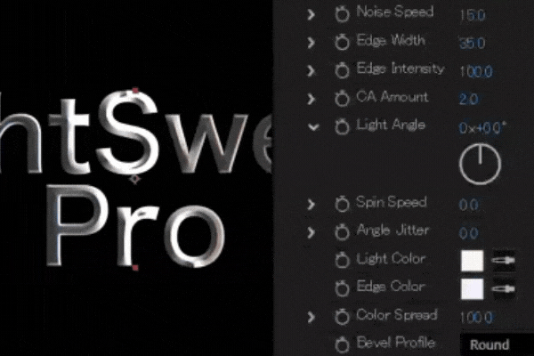 プラグインをインストールしたらAfter Effectsを起動し、エフェクト > InovativeWorksからLightSweepProを適用します。エフェクトを適用するだけでベベルが生成され、ライトスイープが追加されますが、Presetsを切り替えて最適なルックを探ります。スイープの幅や強度といったベーシックなパラメーターに加え、ベベル幅やカーブ、スイープに加えるノイズ強度、色収差(CA Amount)など、細かな調整を実現する設定項目を搭載します。さらにSpin SpeedとAngle Jitterの値を調整することで、キーフレームの必要なくアニメーションを追加することもできます。