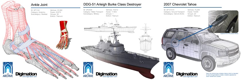 The Archiveのモデルは世界中の多くのフィルム、ゲーム、TV、CMに採用されています。例えば「Blackhawk Down」や「The Rock」に使用された軍用モデルデータも収められています。