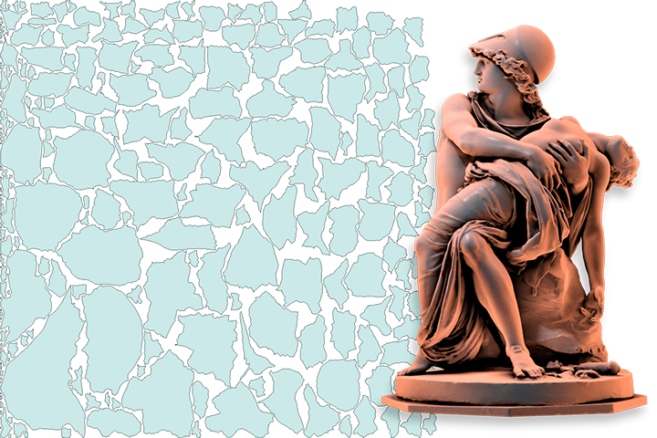 Unwrellaは、複雑で扱いづらいトポロジのUVアンラップを得意としています。巨大な三角形ポリゴンで構成されたフォトグラメトリモデルも、その対象です。このような不規則なメッシュ構造を、最小限のUVチャート数にまとめる作業は、手作業では非常に困難です。