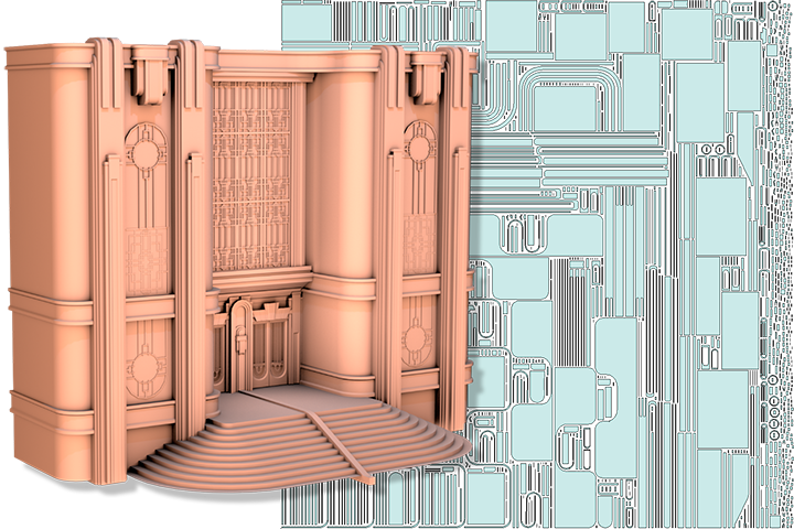 Unwrellaの「Hard-surface」メソッドは、建築要素、機械、武器、工業製品、設計構造物、そして大量の汎用アセットを対象に、高速かつ高品質なUVアンラップを行うために最適化されています。